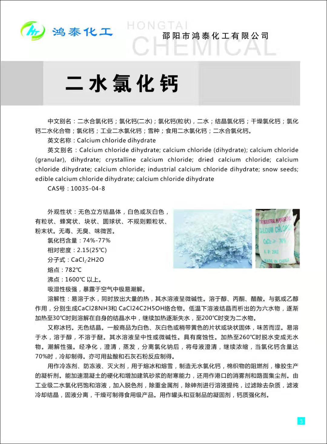 用作冷凍劑、防凍液、滅火劑,用于熔冰和熔雪,制造無水氯化鈣,棉織物的阻燃劑,橡膠生產的凝析劑。能加速混凝土的硬化和增加建筑砂漿的耐寒能力,還用作港口的消霧劑和路面集塵劑。由工業級二水氯化鈣飽和溶液,加入脫色劑,除重金屬劑,除砷劑進行溶液提純,過濾除去雜質,濾液冷卻結晶,固液分離,干燥可制得食用級產品。用作罐頭和豆制品的凝固劑,鈣質強化劑。